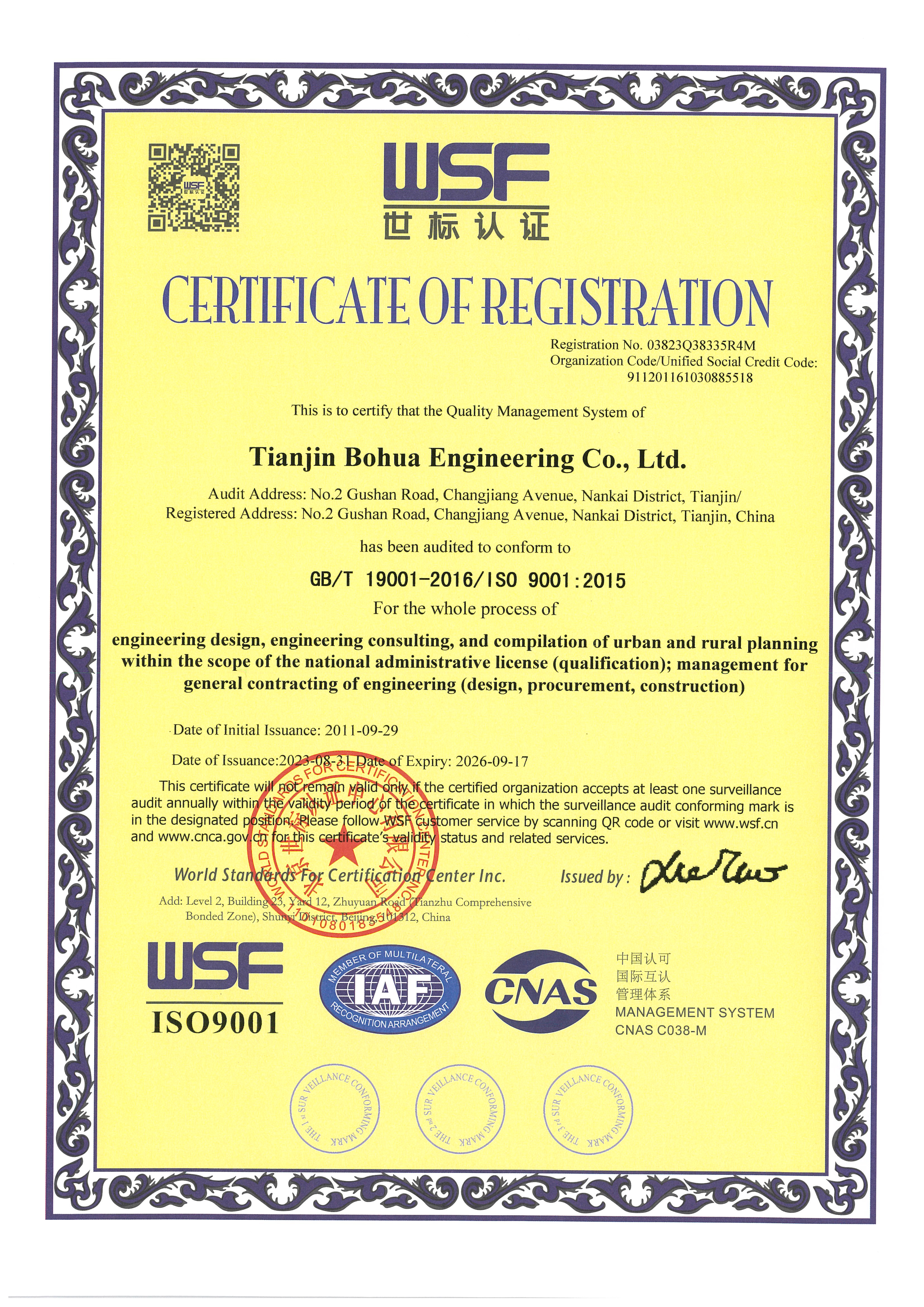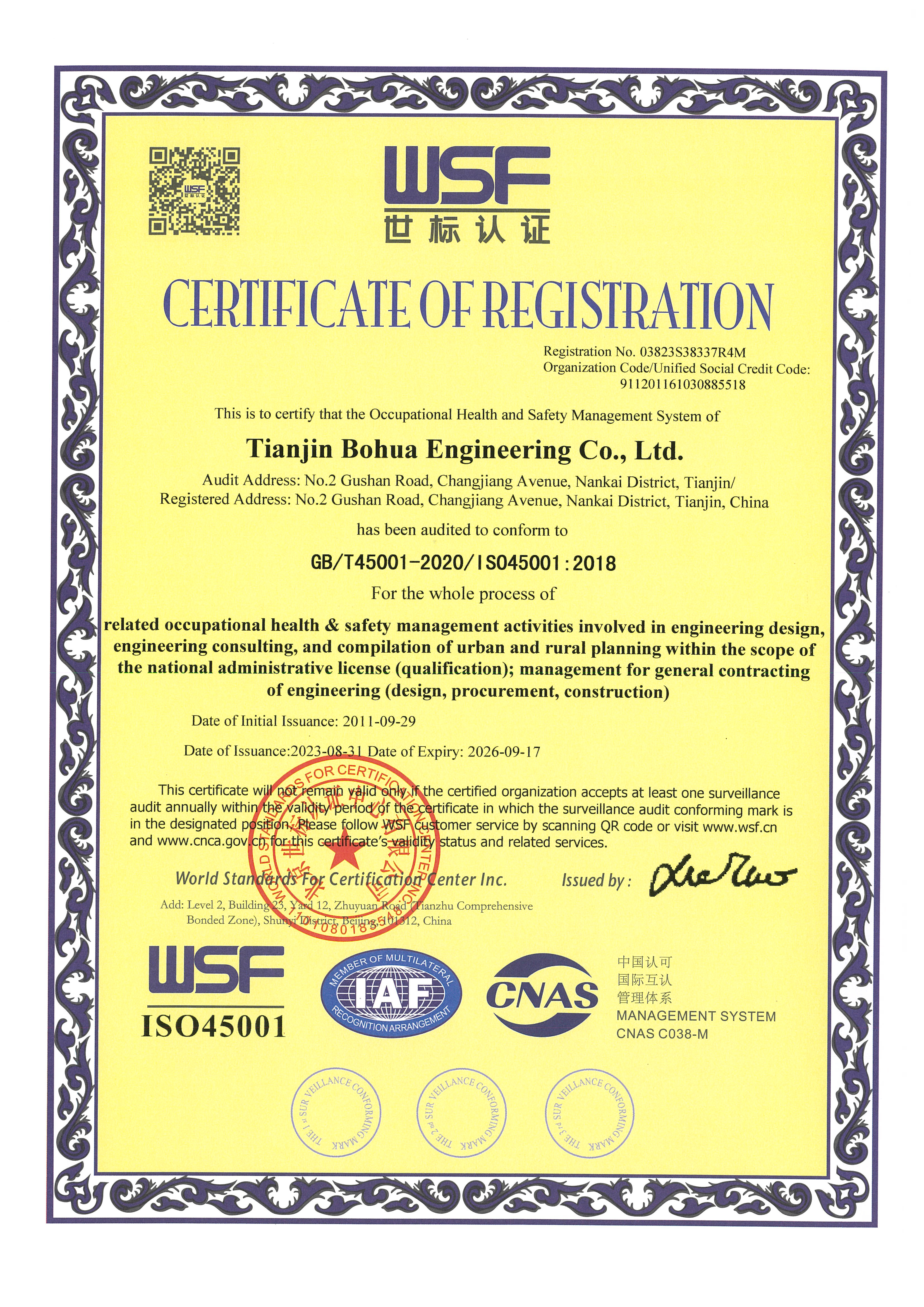 Bohai Engineering passed the ISO9001 quality management system certification, ISO14001 environmental management system certification and ISO45001 occupational health and safety management system certification.