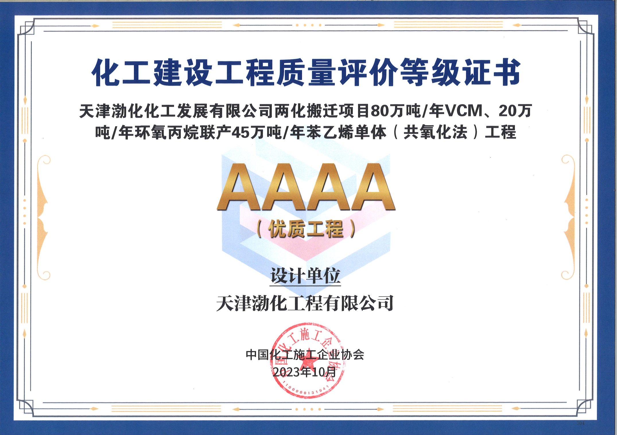10月,公司設(shè)計的天津渤化化工發(fā)展有限公司兩化搬遷項(xiàng)目80萬噸/年VCM工程,獲中國化工施工企業(yè)協(xié)會化工建設(shè)工程質(zhì)量評價AAAA級證書。