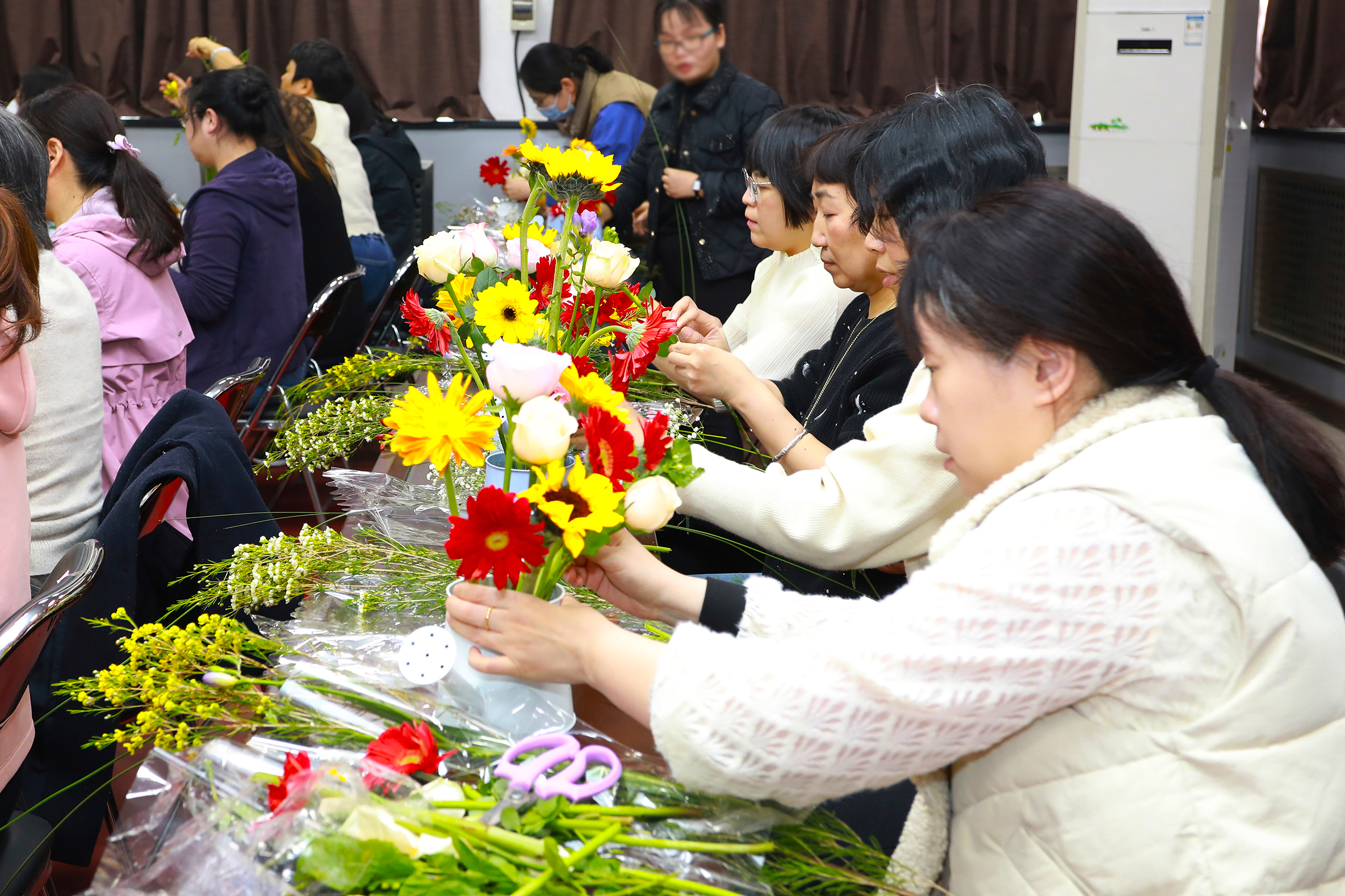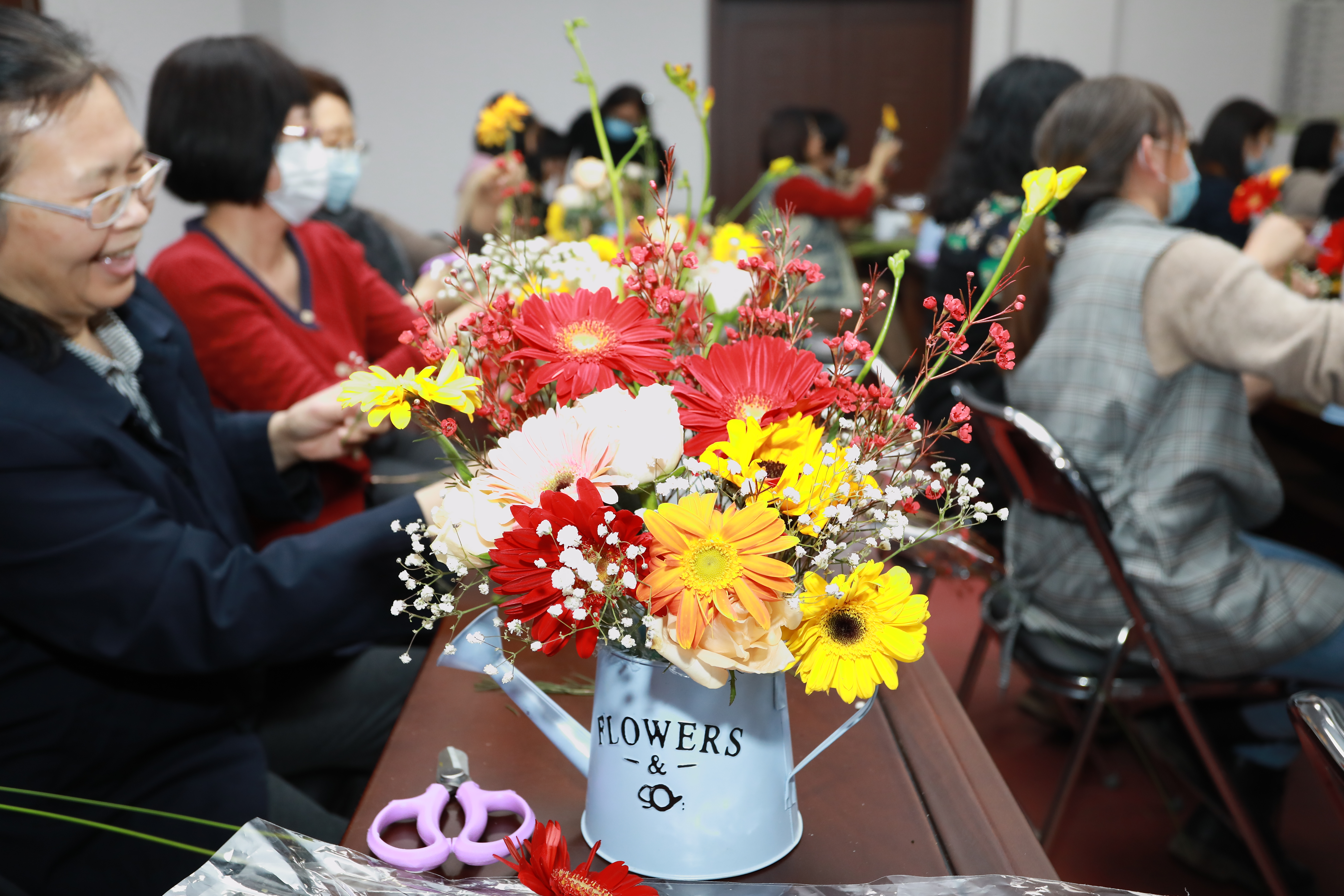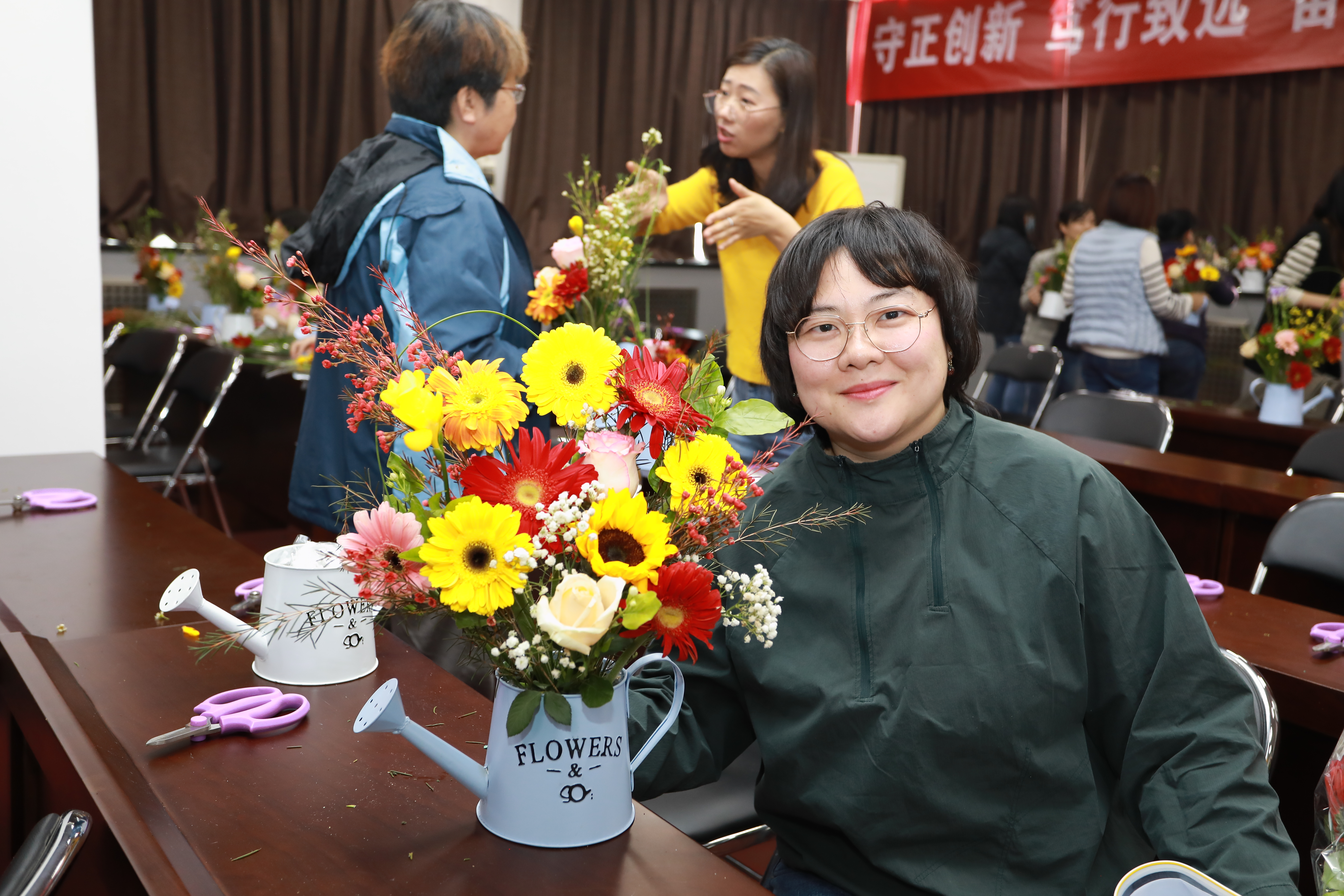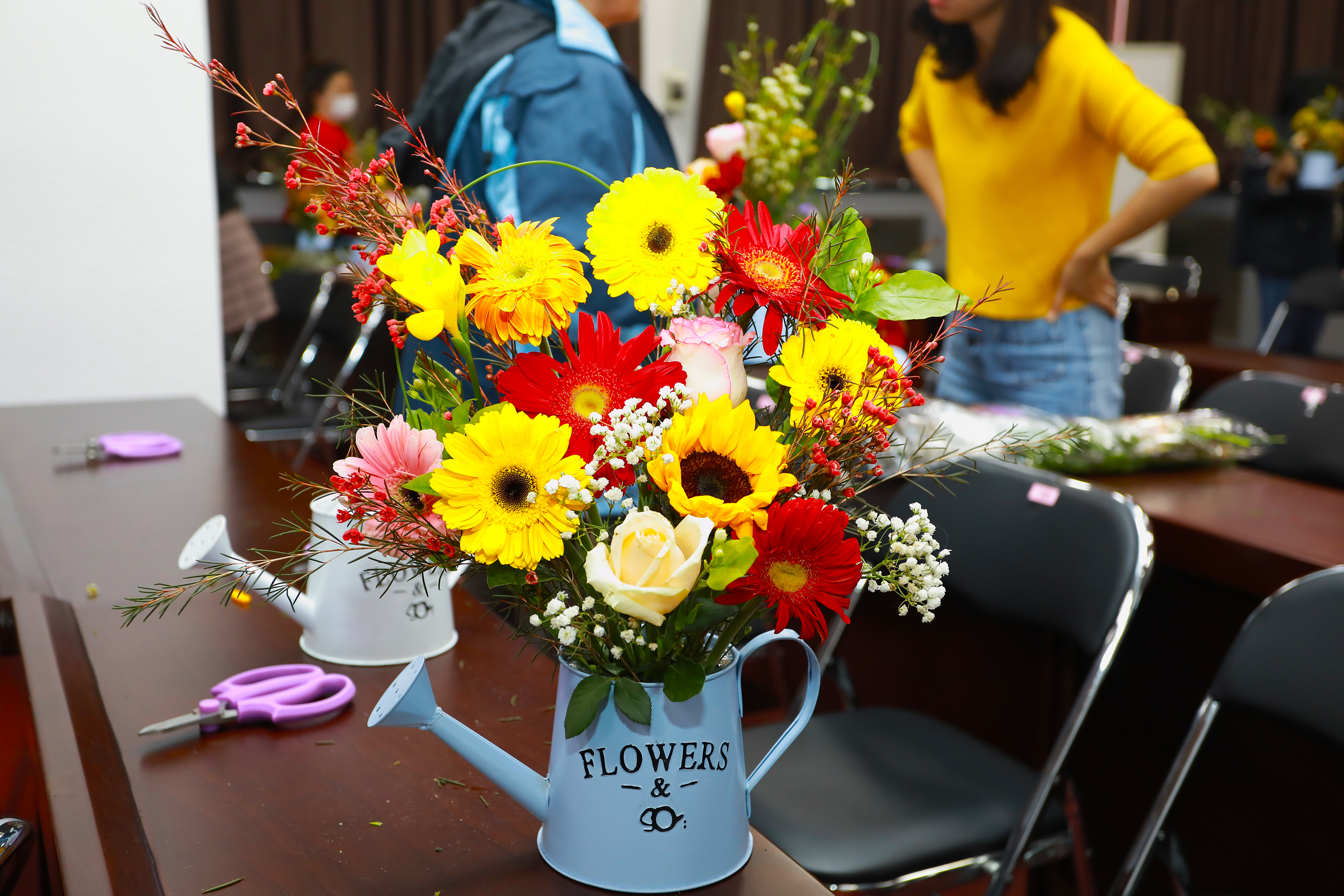 本次活動(dòng)邀請(qǐng)了擁有多年插花經(jīng)驗(yàn)的花藝?yán)蠋?,從鮮花的品種、寓意和養(yǎng)護(hù),到花卉的選擇、顏色的搭配、花枝的修剪等插花技巧進(jìn)行了詳細(xì)講授,并現(xiàn)場(chǎng)示范指導(dǎo)大家進(jìn)行DIY插花。一支支清新淡雅的康乃馨,濃烈絢爛的紅玫瑰,金色活潑的向日葵…….經(jīng)過大家的巧手修枝剪葉及巧妙的創(chuàng)意組合,勾勒出一盆盆賞心悅目的插花作品?;顒?dòng)現(xiàn)場(chǎng)花香四溢,充滿了歡聲笑語。