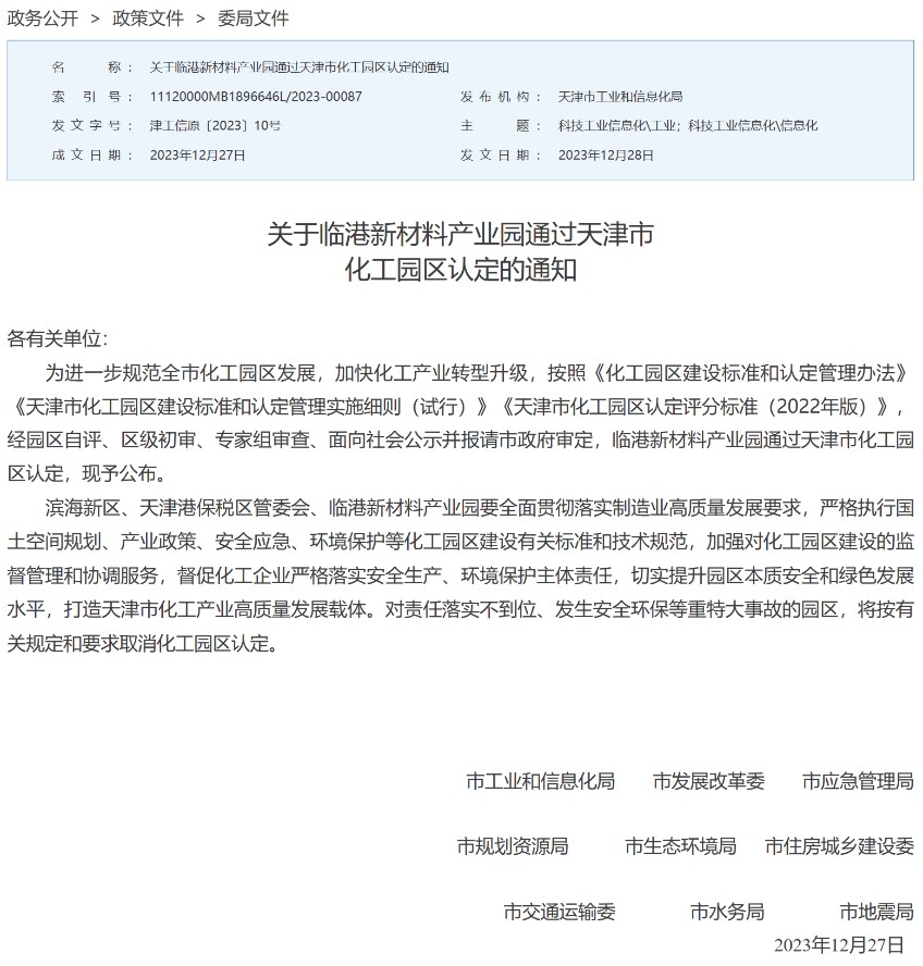 2023 年 2 月 14 日,渤化工程編制的《臨港新材料產(chǎn)業(yè)園總體規(guī)劃(2022-2035 年)》《臨港新材料產(chǎn)業(yè)園產(chǎn)業(yè)規(guī)劃(2022-2035 年)》通過專家評審會。3 月 13 日,濱海新區(qū)工業(yè)和信息化局組織各相關(guān)部門在空港投資發(fā)展中心開展臨港新材料產(chǎn)業(yè)園區(qū)級初審工作。4 月 28 日,天津港保稅區(qū)城環(huán)局組織《臨港新材料產(chǎn)業(yè)園總體規(guī)劃(2022-2035 年)環(huán)境影響評價(jià)》公眾參與座談會。5 月 22 日,天津市工業(yè)和信息化局組織各相關(guān)部門在天津港保稅區(qū)臨港環(huán)境監(jiān)測和應(yīng)急管理中心開展臨港新材料產(chǎn)業(yè)園園區(qū)認(rèn)定相關(guān)工作。6 月 27 日至 7 月 3 日,天津市工信局?jǐn)M認(rèn)定“臨港新材料產(chǎn)業(yè)園”為化工園區(qū),面向社會公示。12 月 28 日,經(jīng)園區(qū)自評、區(qū)級初審、專家組審查、面向社會公示并報(bào)請市政府審定,臨港新材料產(chǎn)業(yè)園通過天津市化工園區(qū)認(rèn)定。