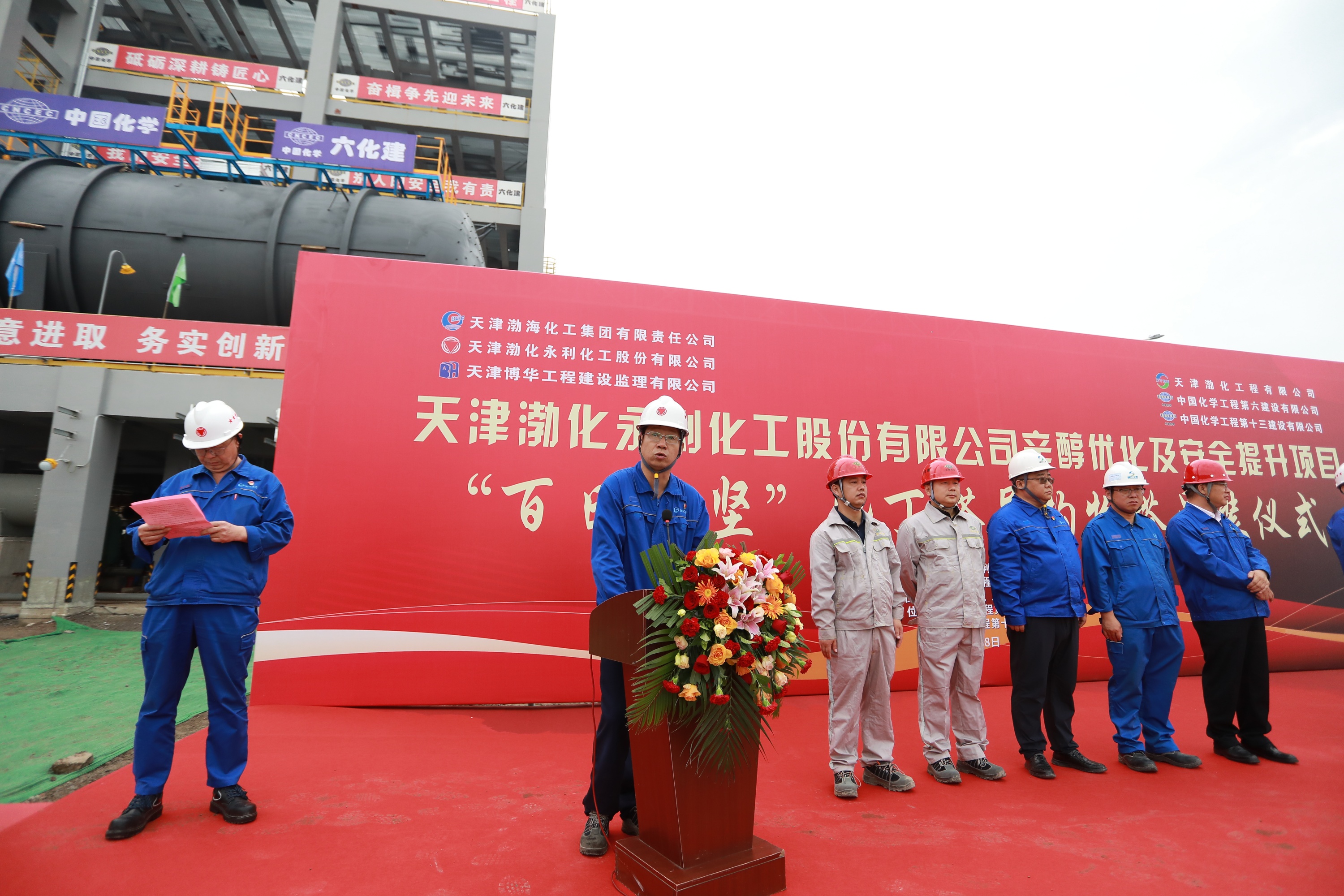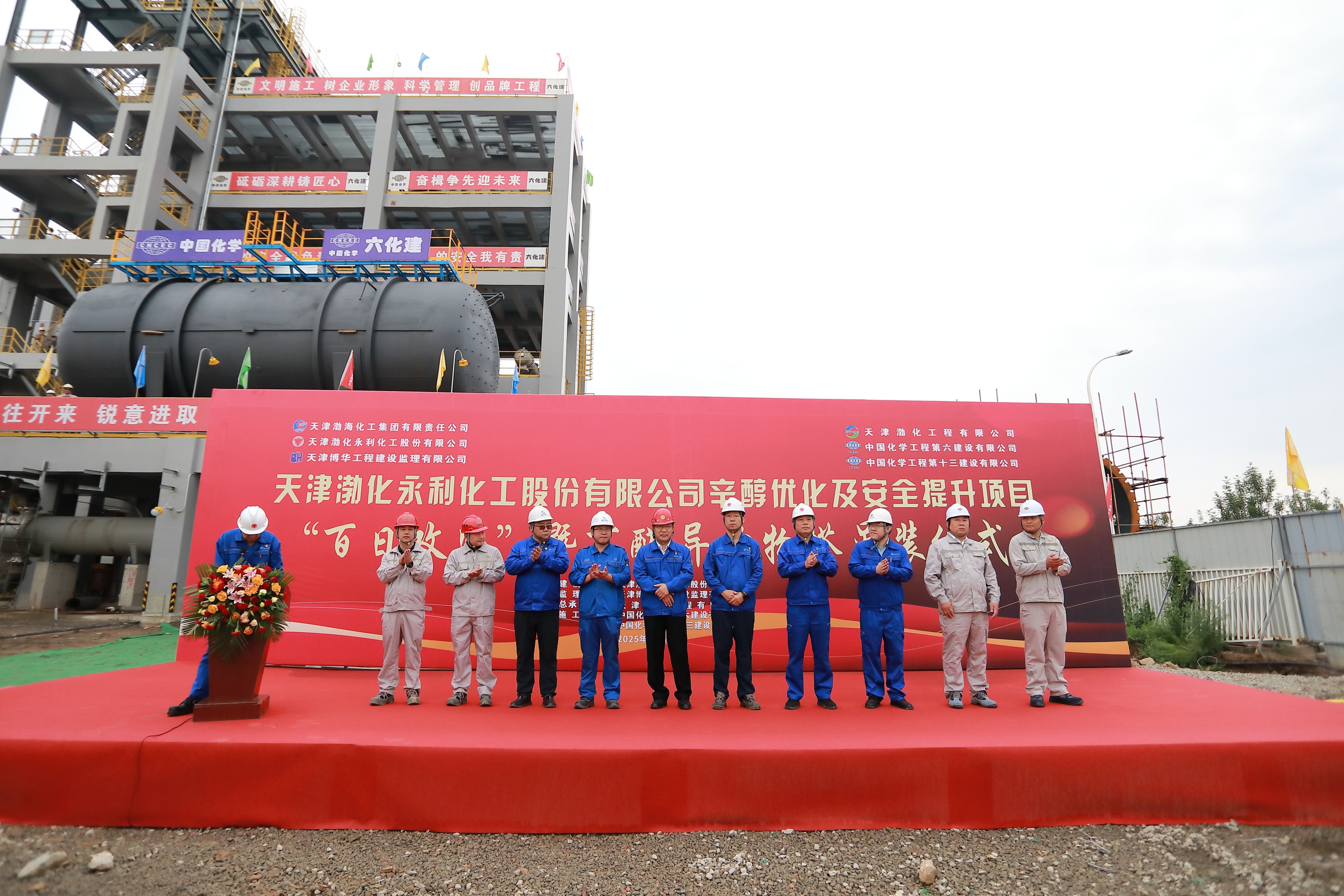 7月8日上午,天津渤化永利化工股份有限公司舉行辛醇優(yōu)化及安全提升項目“百日攻堅”暨丁醛異構(gòu)物塔吊裝儀式。渤化集團(tuán)副總經(jīng)理張曄輝及集團(tuán)相關(guān)單位負(fù)責(zé)人;渤化永利黨委書記、董事長魏以峰,黨委副書記、總經(jīng)理王凱;渤化工程黨委書記、董事長詹宏智,黨委副書記、總經(jīng)理莫冠群;中化六建、中化十三建、博華監(jiān)理等參建單位負(fù)責(zé)人參會并作表態(tài)發(fā)言。