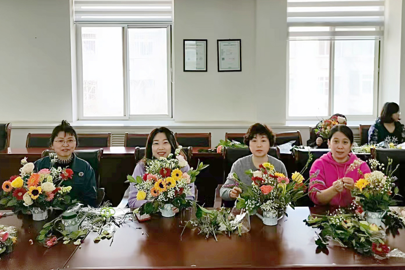 本次活動(dòng)邀請(qǐng)了擁有多年插花經(jīng)驗(yàn)的花藝?yán)蠋?,從鮮花的品種、寓意和養(yǎng)護(hù),到花卉的選擇、顏色的搭配、花枝的修剪等插花技巧進(jìn)行了詳細(xì)講授,并現(xiàn)場(chǎng)示范指導(dǎo)大家進(jìn)行DIY插花。一支支清新淡雅的康乃馨,濃烈絢爛的紅玫瑰,金色活潑的向日葵…….經(jīng)過(guò)大家的巧手修枝剪葉及巧妙的創(chuàng)意組合,勾勒出一盆盆賞心悅目的插花作品?;顒?dòng)現(xiàn)場(chǎng)花香四溢,充滿了歡聲笑語(yǔ)。